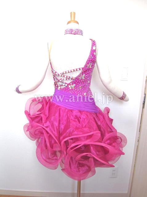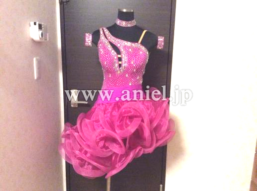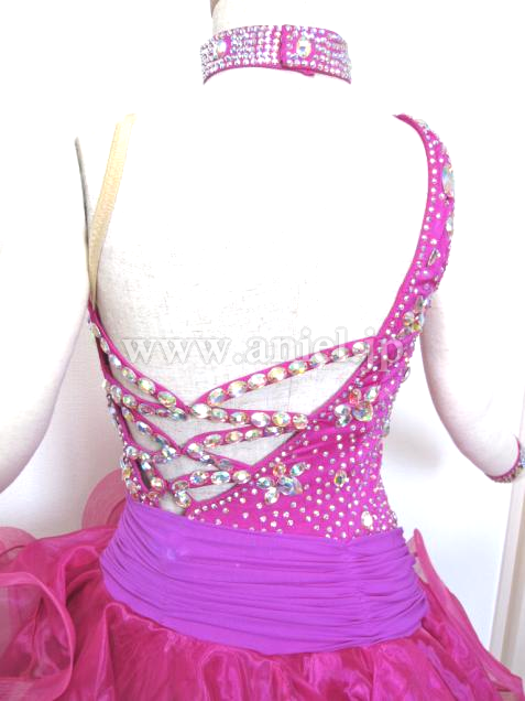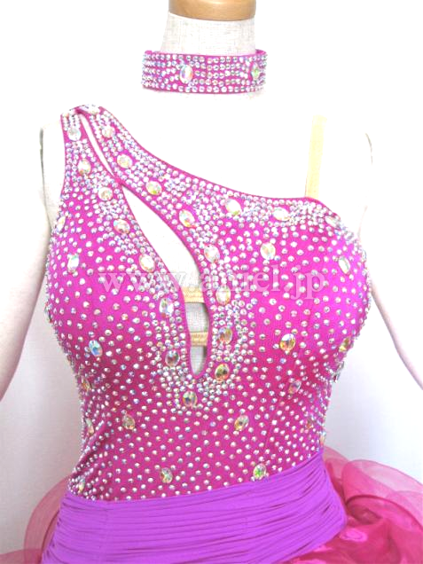 クリスアンの生地を使用、スワロフスキーストーンを20グロス(約4000個)ほど使ったかなり輝くドレスです。スカートはとてもボリュームがあり、目立ちます。ワンショルダーの人気のデザインです。ボリュームのあるスカートがフロアで目立ち、良く振れるため動きが大きくみえます。伸縮性があって、着脱が楽です。