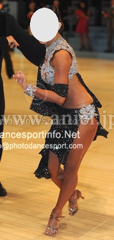ドレープ部分とスカートの全体にストーンが貼られており、全体がよく光りたいへん目立つドレスです。