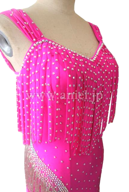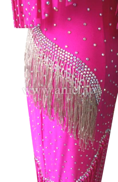 ★後ろ背中から前面ヒップにかけて、石とシルバーの竹ビーズを大量に縫い付けており、お腹辺りを細く見せ、回転やツイストした時に布フリンジと違った跳ねるような細かい動きを出す;