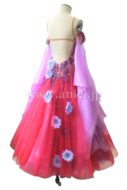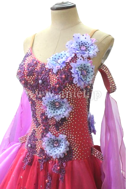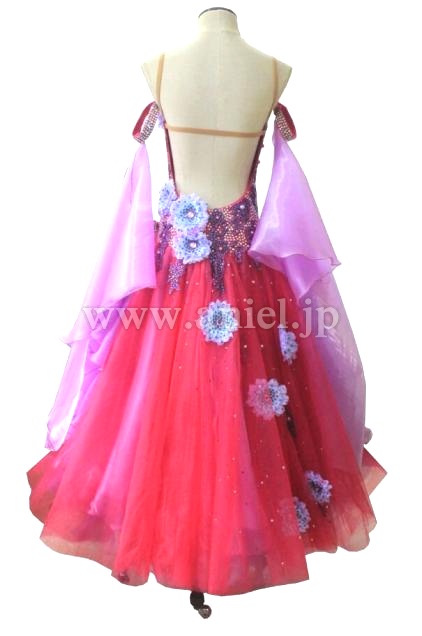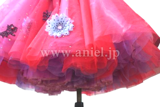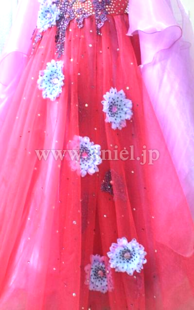 ★一、二枚目-----新素材の光沢ありチュール生地を使用し、前後とも斜めに立体花と石を飾り、回転時は大変素晴らしい表現を見せてくれる;