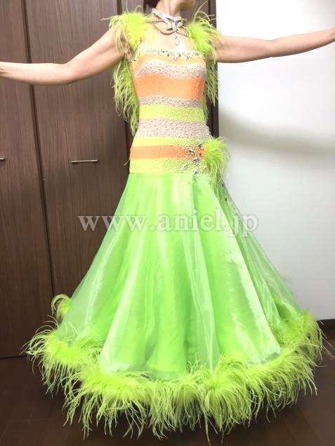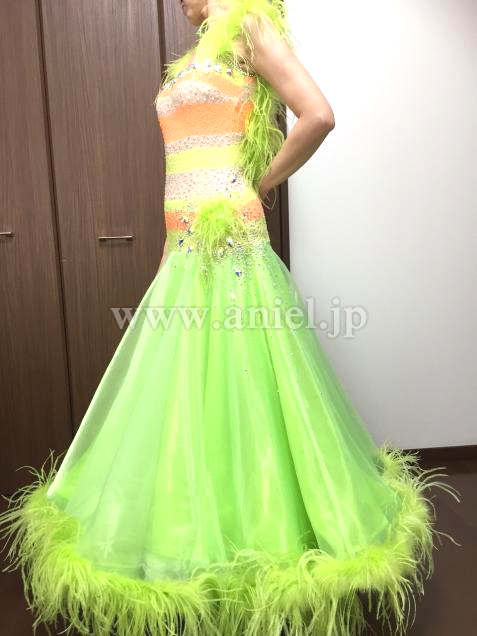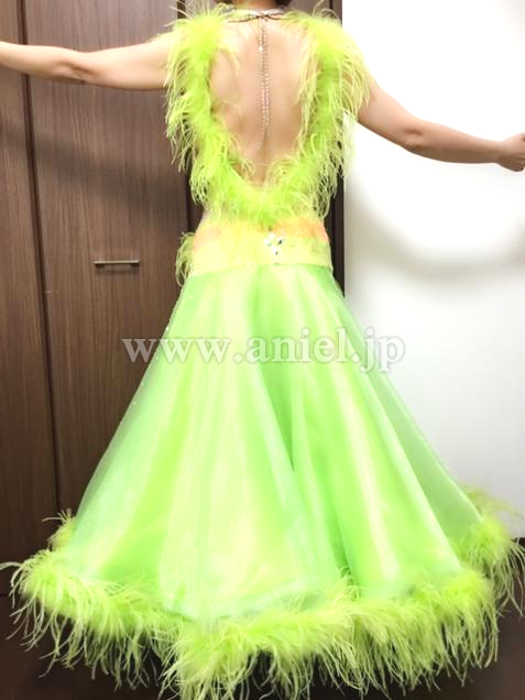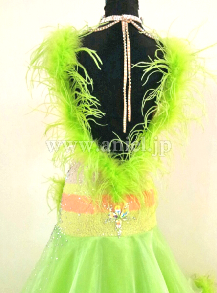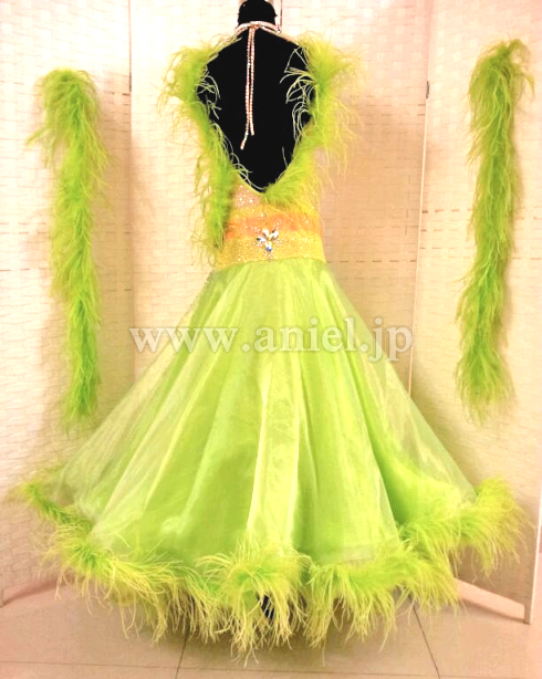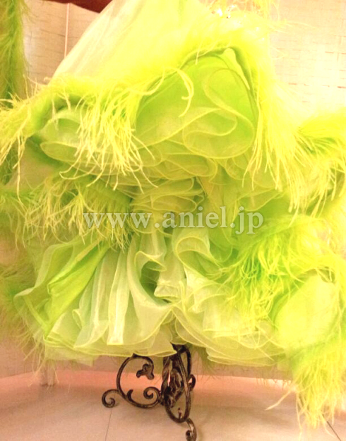 黄緑の羽根が裾やフロートに使われていてとてもゴージャスです。