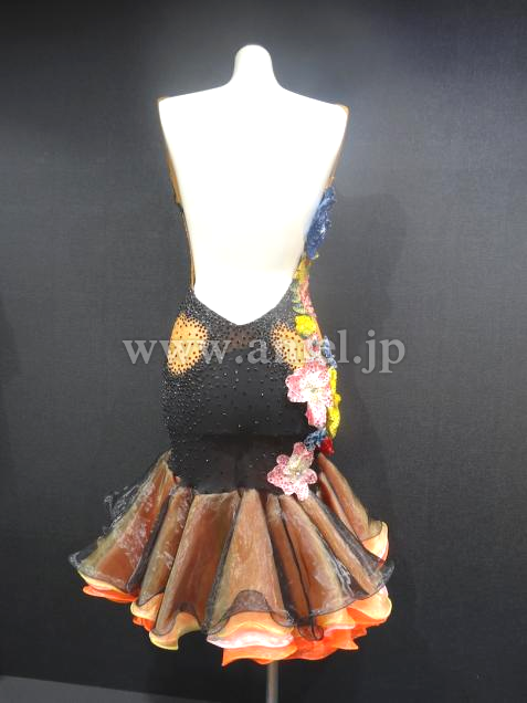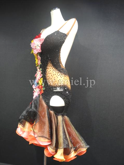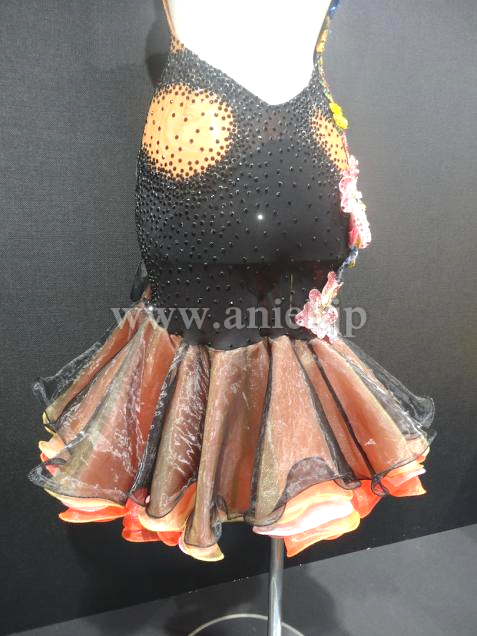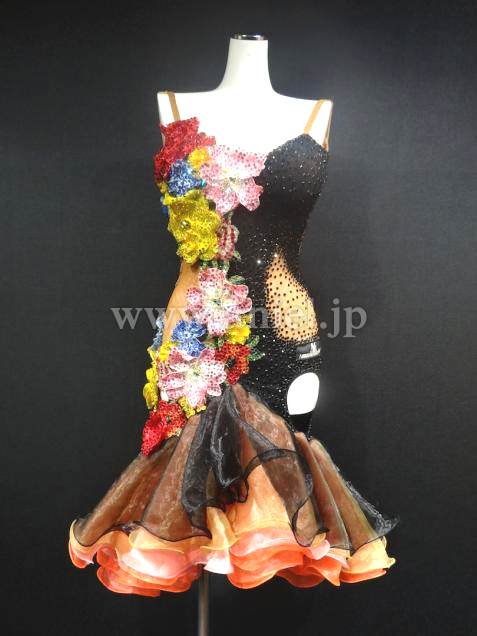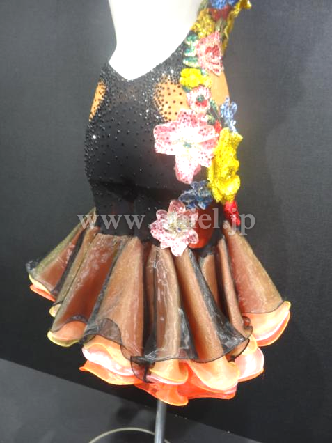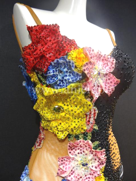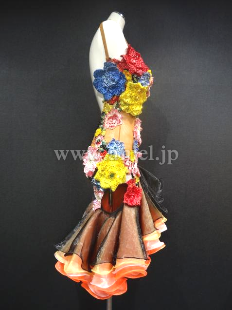 キュートなフリルスカートにたくさんのカラフルなフラワーモチーフが使われたデザインです。モチーフにはたくさんのストーンが散りばめられています。