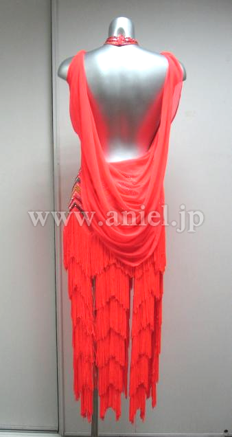 外国製ドレスで、生地にストレッチが効き、とても着心地がいいです。低めにデザインされたフリンジ切り替えが、ウエストを高く、くびれをしっかり見せてくれるためスタイル良く見えます!ボディにびっしり装飾されたスワロフスキーと、蛍光オレンジのフリンジが照明にも映え、目を引きます。背中のドレープとフリンジが動きを大きく見せてくれるため、サンバやチャチャチャに最適です。