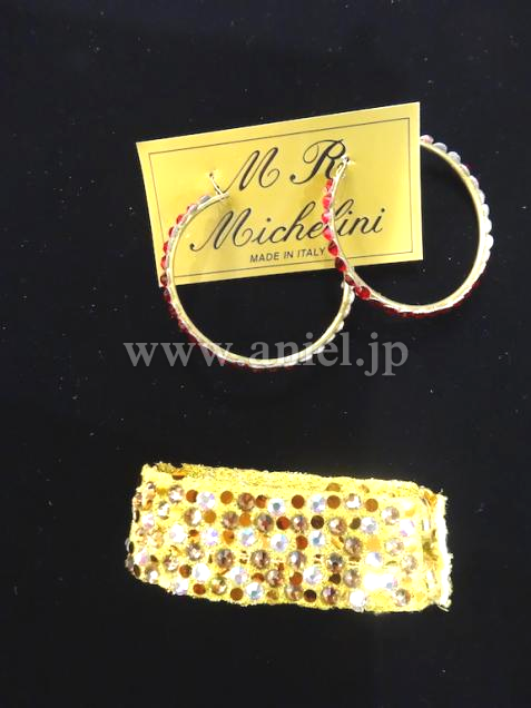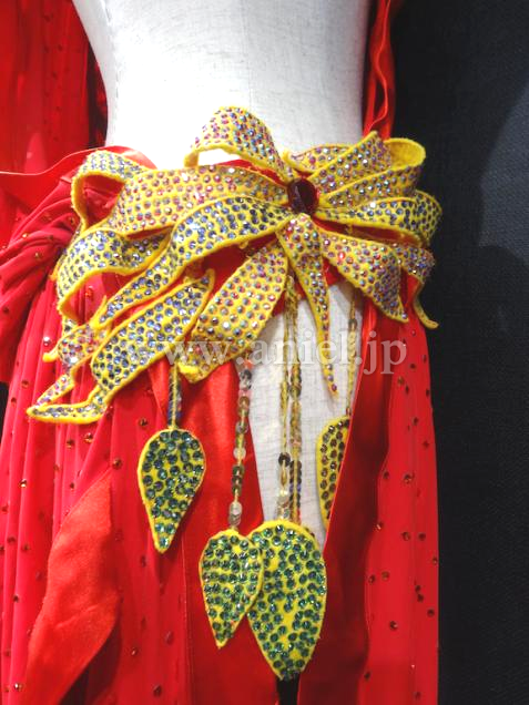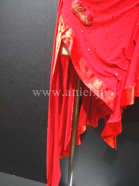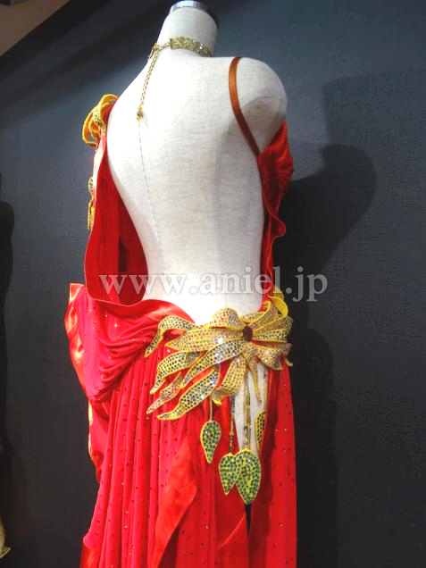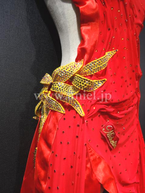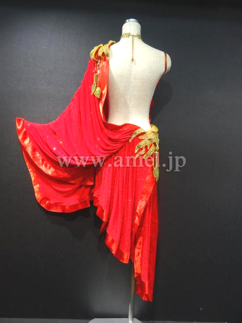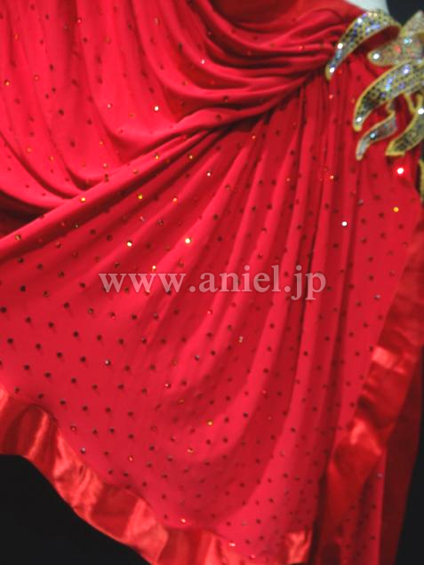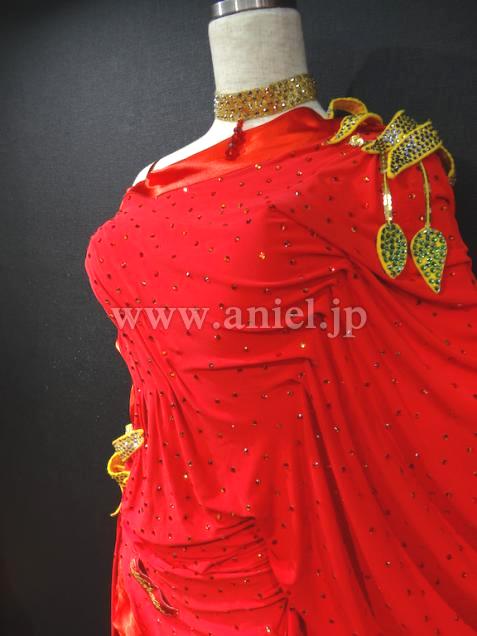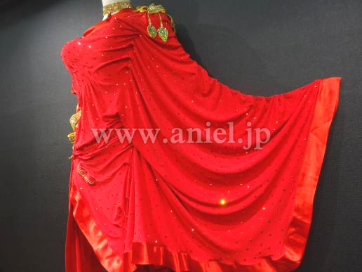 赤のクレープ生地がたっぷり使われた面白いデザインです。ワンショルダーから左手首までドレープで覆われています。立体のお花のモチーフはそれぞれの花びらに違う色のスワロが使われています。ボディの部分にもスワロフスキーが散りばめられていて、実物は特に綺麗です。装飾はバングルとピアスです。