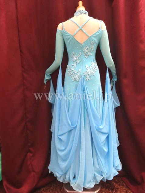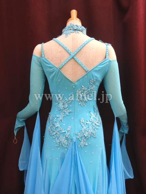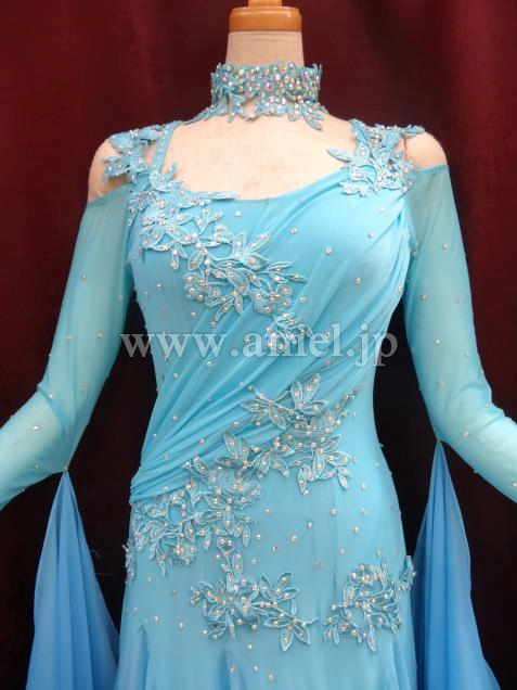 淡い水色の上品なドレスです。ボディにはモチーフレースとストーンが散りばめられています。