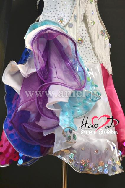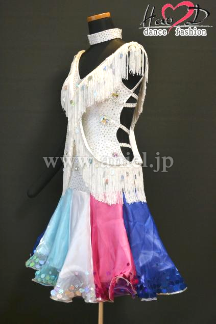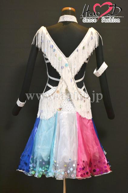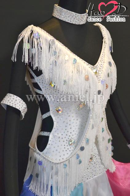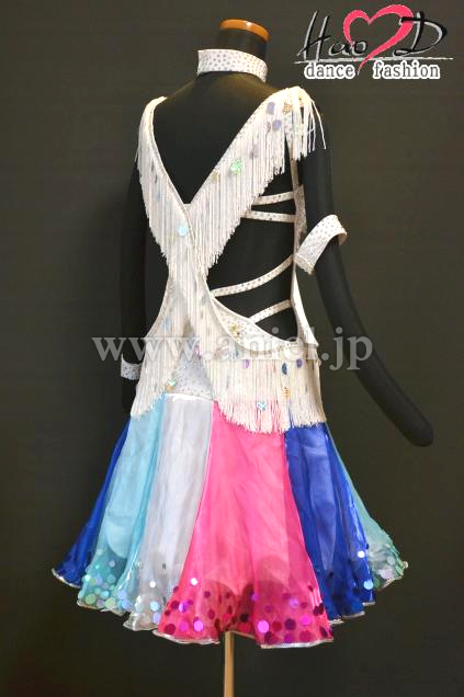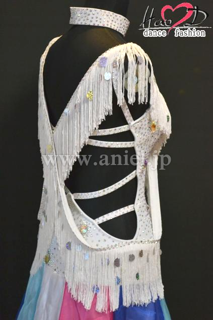 ボディーをシャープに見せるクロス状をフリンジで作り出した、動き抜群な可愛いラテンドレス;