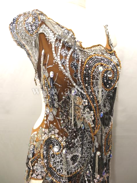 黒のチュールに銀色のスパンコール、ビーズ、刺繍、ストーンで複雑に模様が描かれているとても高価な生地。