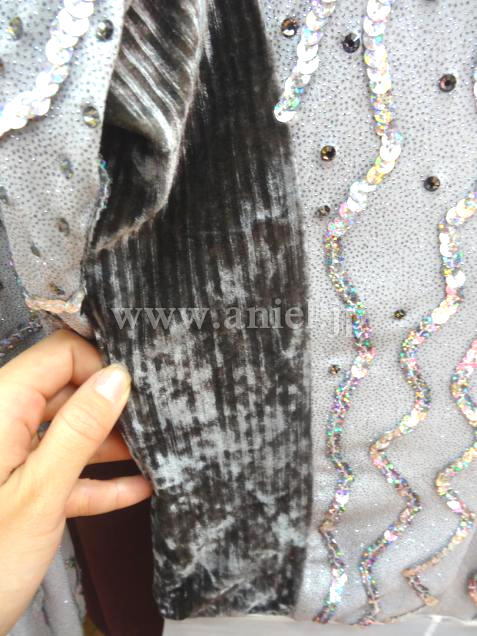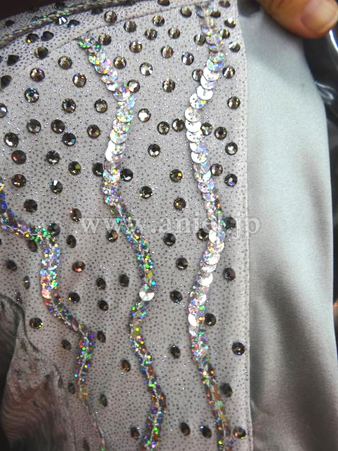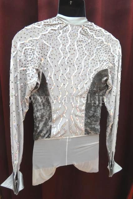 グレーにシルバーのラメが入ったイタリア製の生地にスパンコールで波のラインが縫い付けられ、同じくシルバーの石が散りばめられた開襟シャツです。袖とカラーはサテンで縁取りしています。両脇腹にはイタリア製のベルベットが使われていて、光沢があり美しく、非常に面白い印象です。