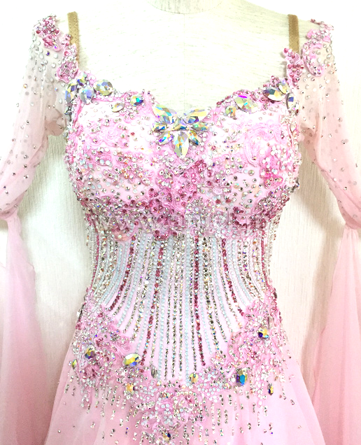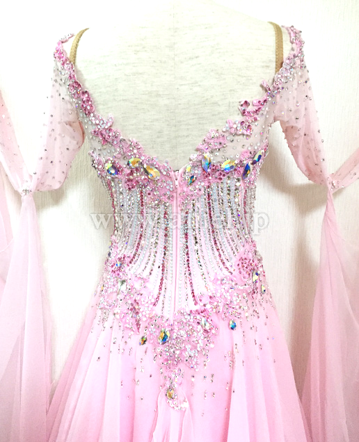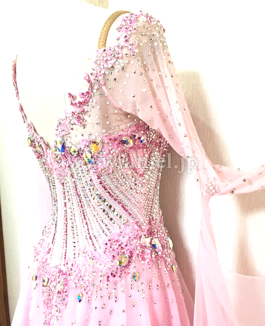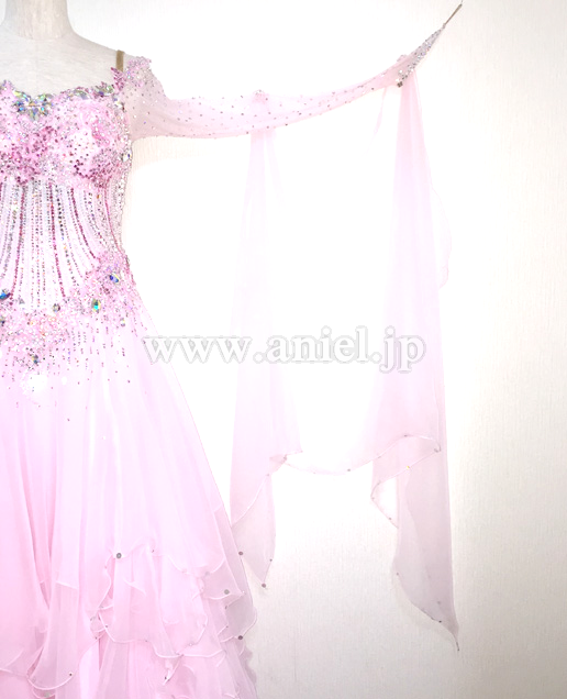ふんわりと優しくツヤのあるベビーピンクで、裾もレイヤード風ですが造りに工夫がしてあり軽くて踊りやすいです。