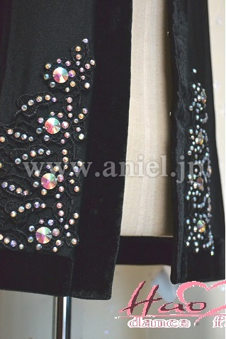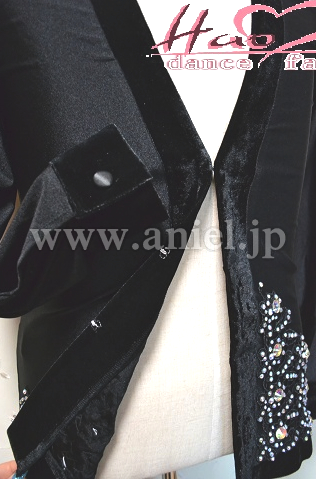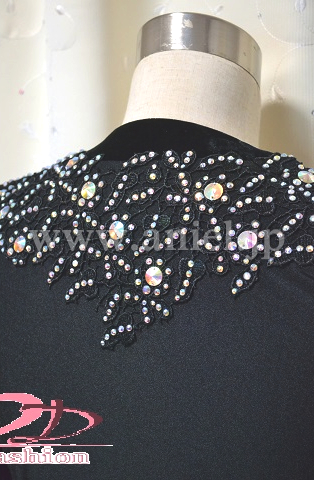 肩から背中はVラインに、前面の裾はAラインに、黒いモチーフを縫い付け、オーロラ虹色の石で繊細な柄を描き、ウエストを細く見せる絶妙なバランス感覚;