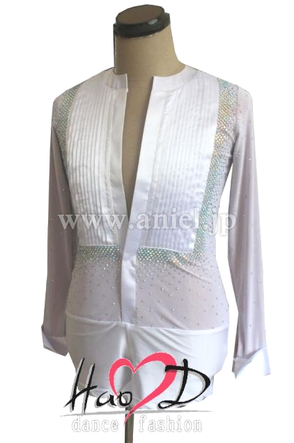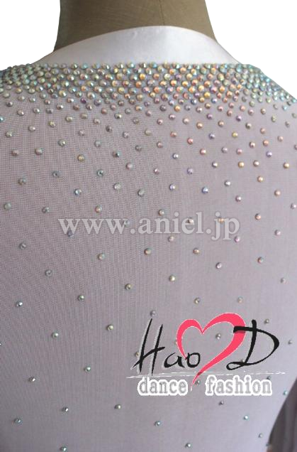 胸元は白いサテン生地でタックを入れてボリューミーに、石でイカ胸のラインを囲み上品に仕上げており;