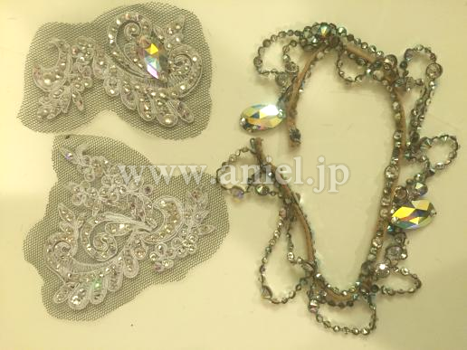 上体はベージュのネットに、白のレースを散らし、その上にオーロラの石をふんだんに散らしています。