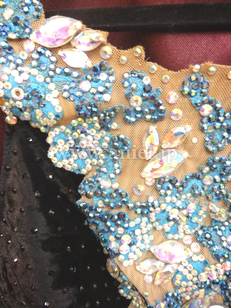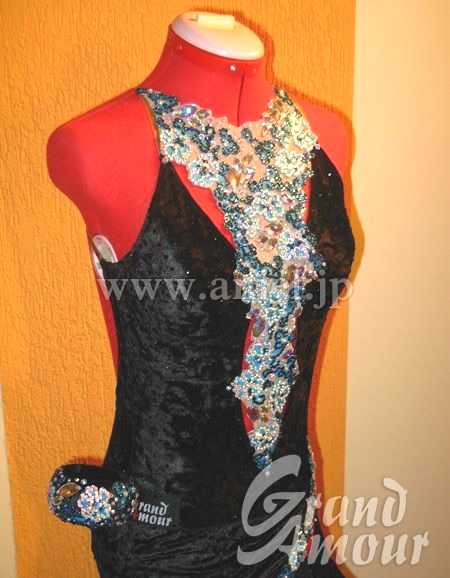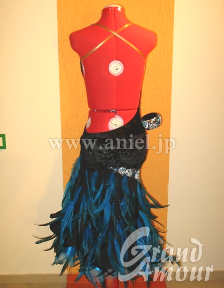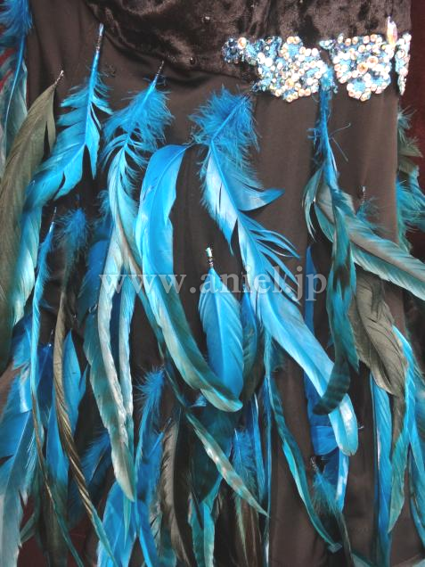 羽根が大人っぽく、フロアで存在感のあるドレスです。ボディはベロア素材、ヒップのラインがきれいです。スカートのカットもセクシーで、脚がキレイに見えます。バングルとアームレットが付属しています。