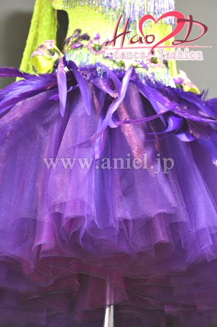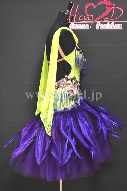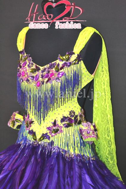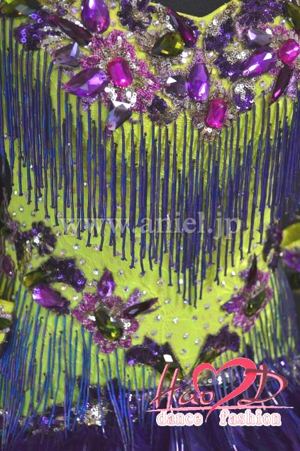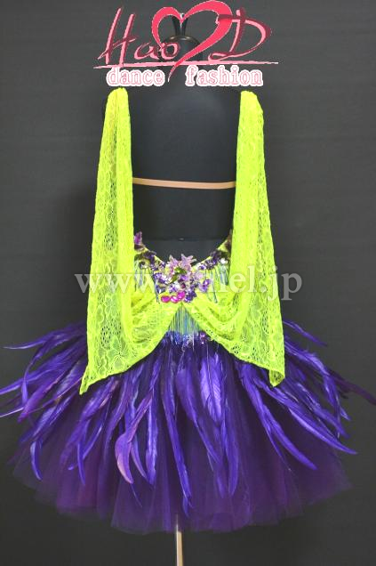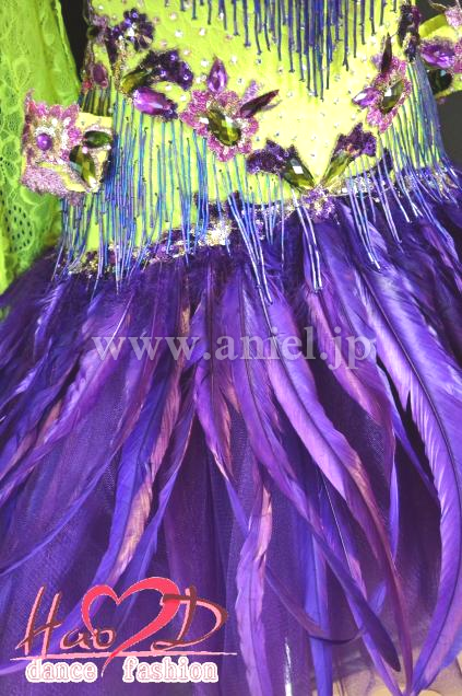 蛍光緑レースに紫モチーフ&竹ビーズ&ロング羽;