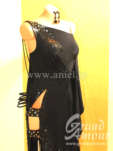 2015年のロンドンインターのプロライジングで優勝したSabrina Manziのスポンサードレスです。シンプルながら凝ったラインで、ドレープ感とさりげないパンク調のスタッズが特徴的です。少しカジュアルな雰囲気なので、曲目によってデモやミックスコンペなどのミニコンペにもオススメです。