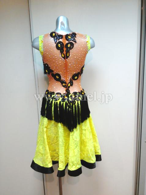 黄色のレース生地のスカートに黒のタッセルフリンジの飾りがインパクト大のドレスです。