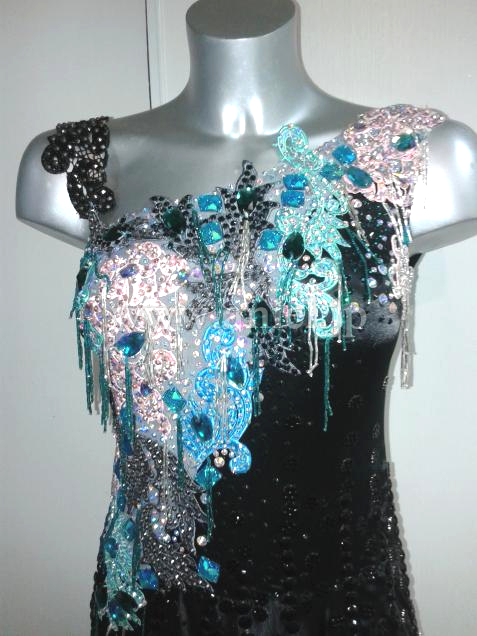黒のシックなベルベットボディに胸元のモチーフレースの飾りがアクセントになっているドレスです。
