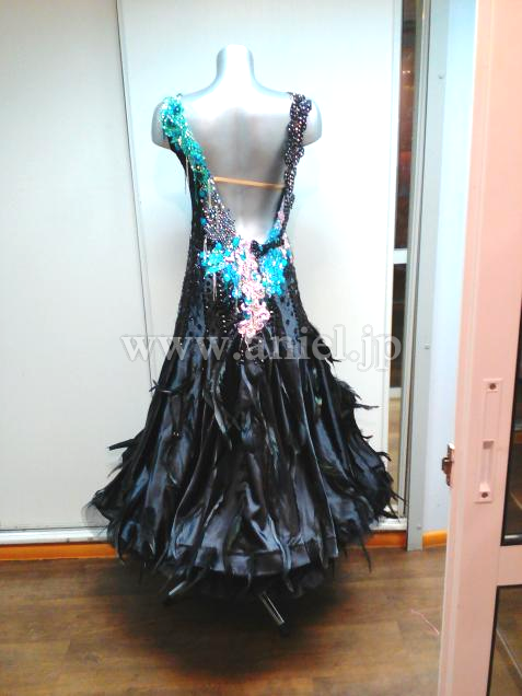 光沢のあるスカートには大きな羽根が散りばめられています。