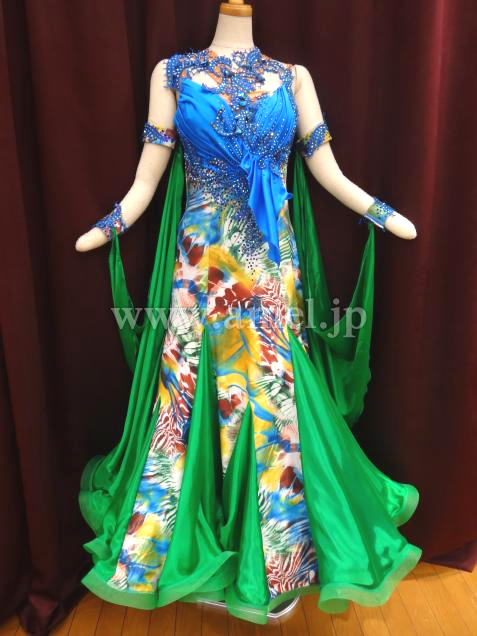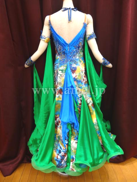 バスト周りのブルー、スカートとフロートのグリーンの配色の美しいドレスです。