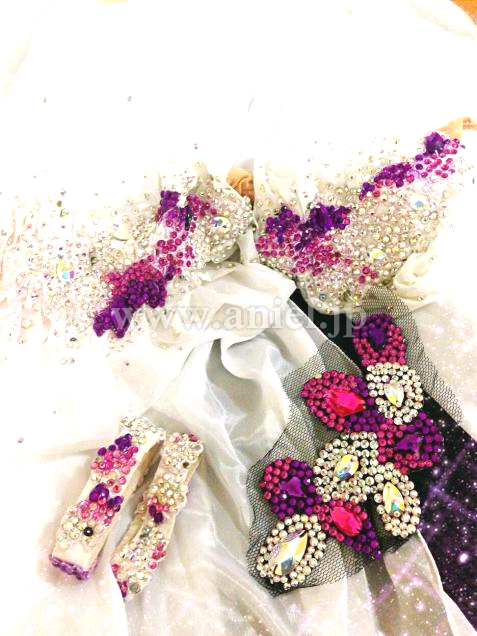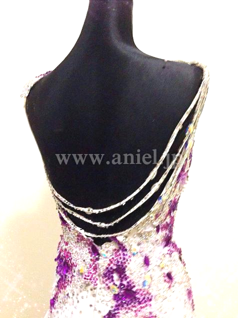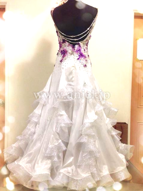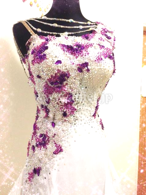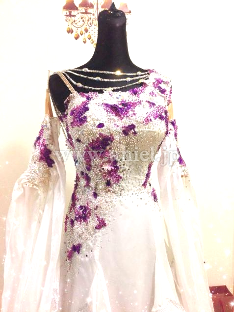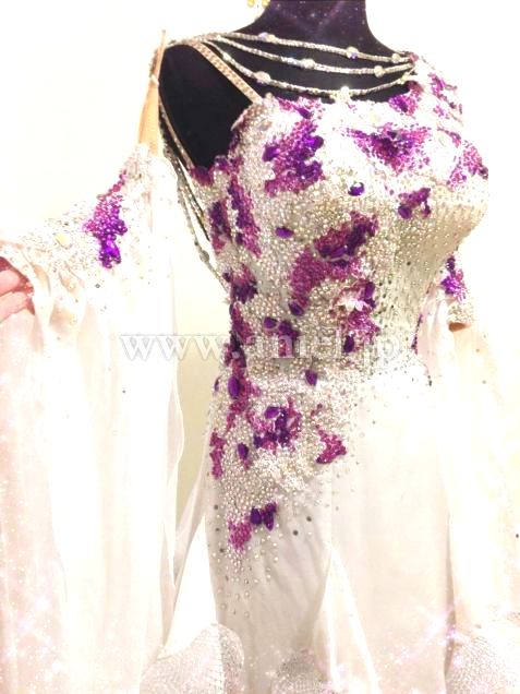 沢山のスワロフスキーが付いた、白地に紫の模様が綺麗なエレガントなドレスです。