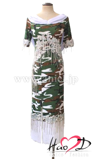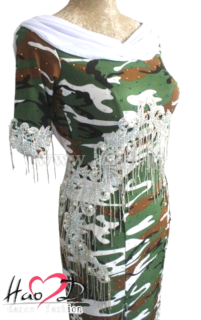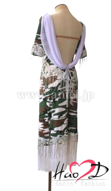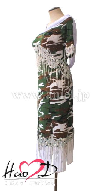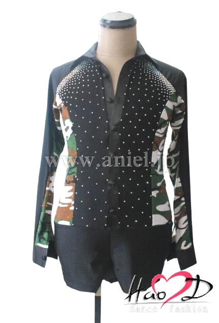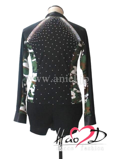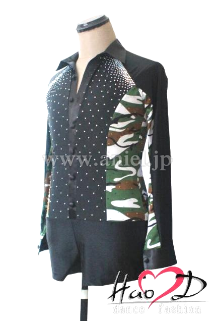 黒をメーンに、腕の内側と脇下をドレスに合わせて迷彩柄を取り入れて、スタイリッシュなカッコイイラテンシャツに仕上げ;