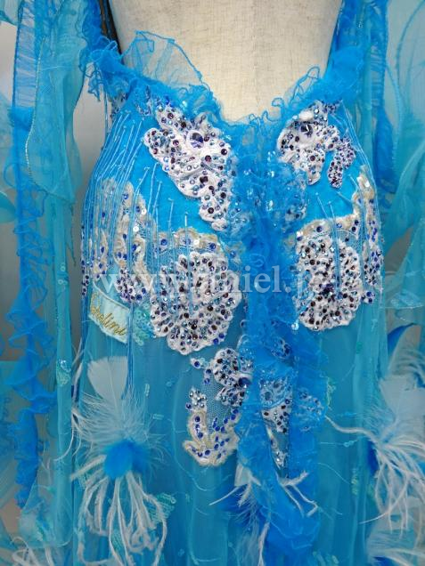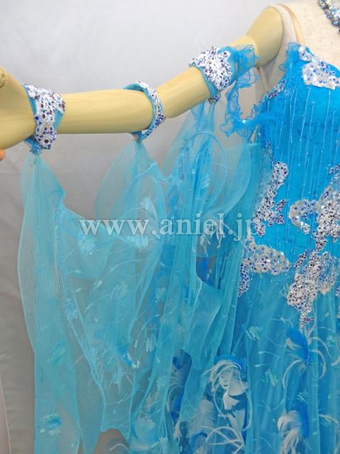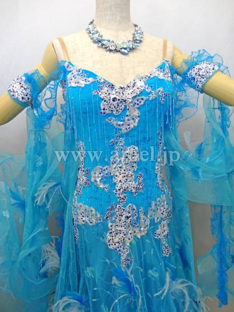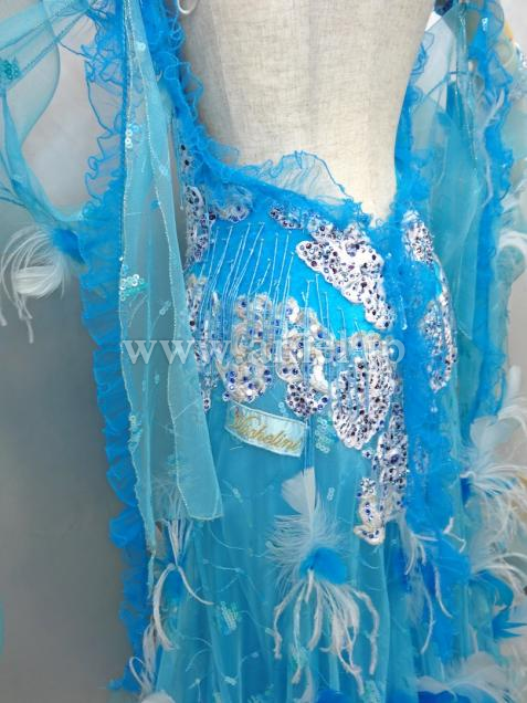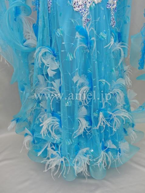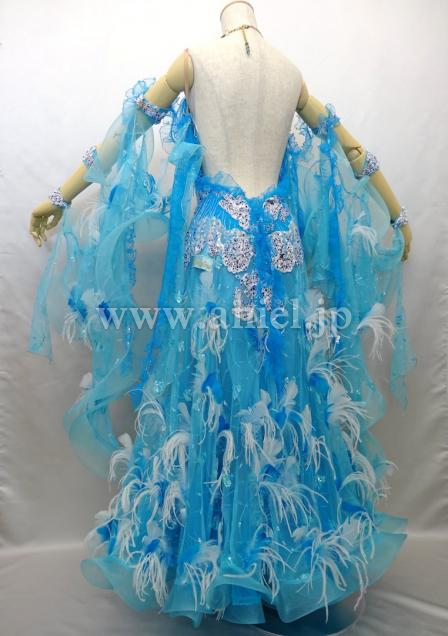 ターコイズブルーに羽があしらわれており、エレガントなドレスです。