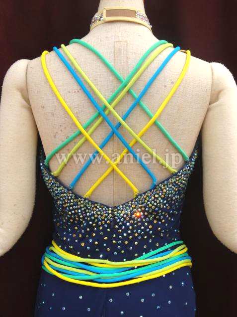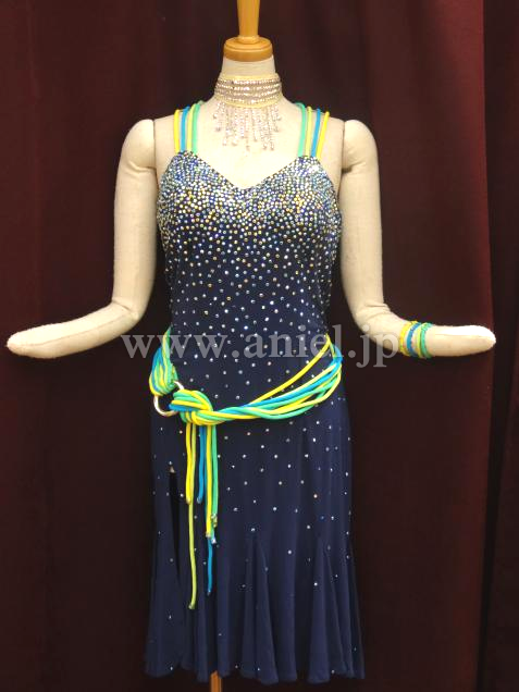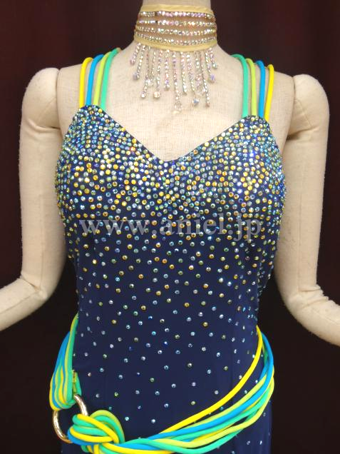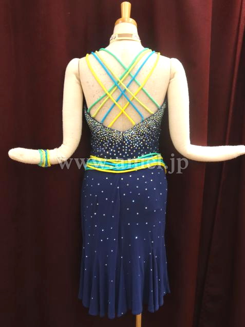 紺色の本体と蛍光色のベルト、胸にびっしりついたストーンの組み合わせがとても綺麗です。スカートも短くなく、全体的に上品な大人な雰囲気です。スリットも深くてセクシーです。