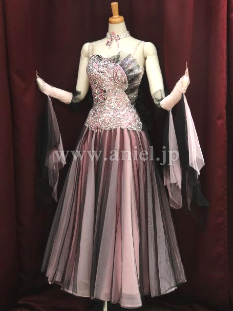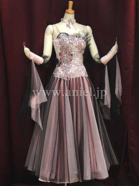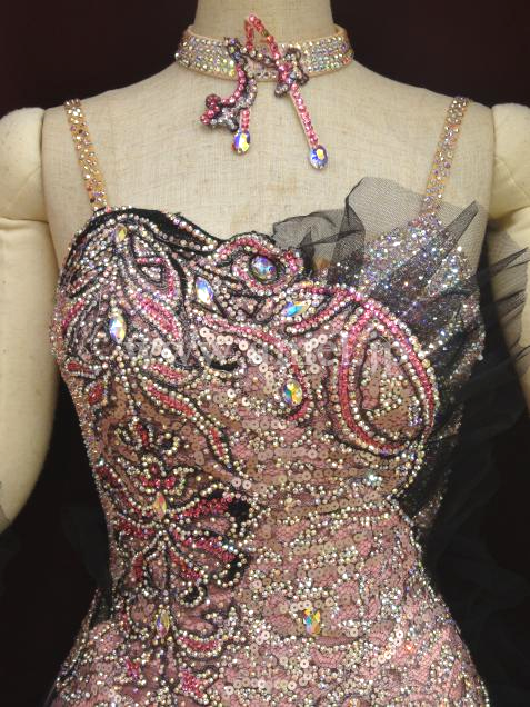 全面にスワロフスキーの石がびっしりついています。後ろのウエストの部分や手甲にも石がついていて豪華。チュールスカートはボリュームがあり、美しく揺れます。