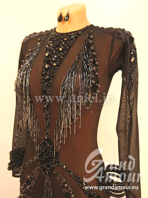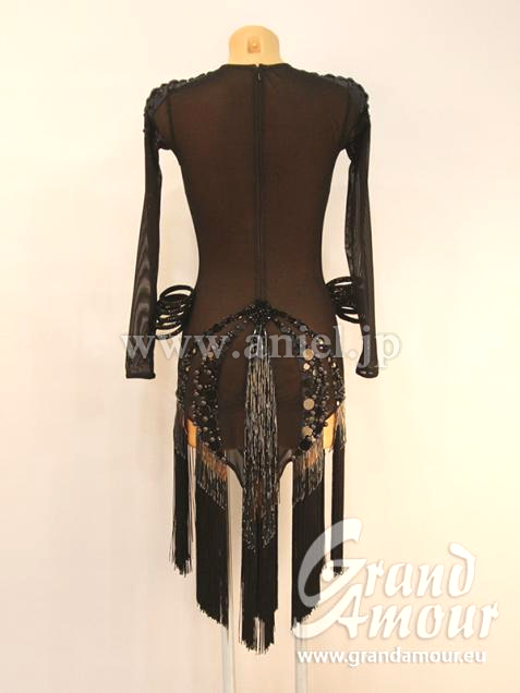 スカートのフリンジと竹ビーズがタイトなドレスの中に動きを出します。