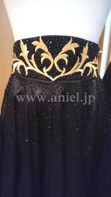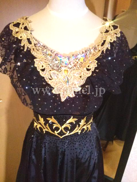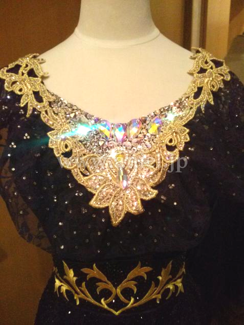 胸元やウエスト周り、モチーフレースにはストーンがたっぷり使われよく輝きます。
