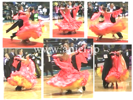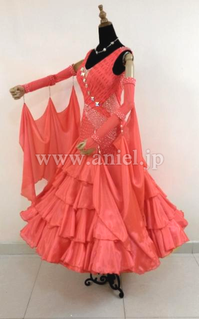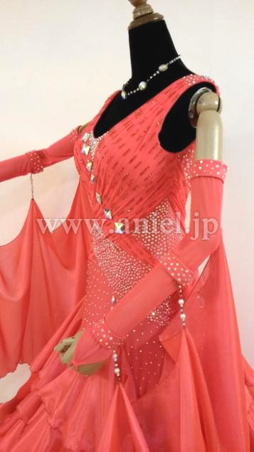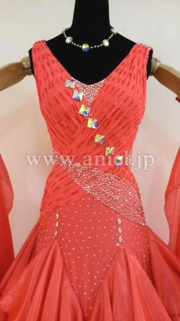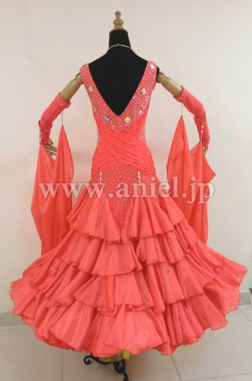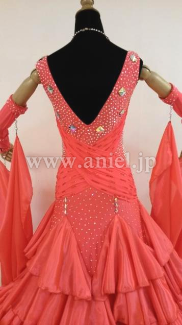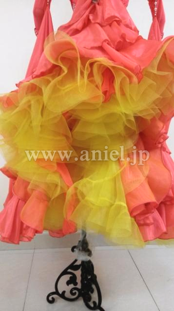 ボディは伸縮し、着心地のよいドレスです。ボディはたくさんのスワロフスキーストーンで装飾されています。大きなフロートもスワロフスキーストーンとパールで装飾されています。スカートにはたくさんのホースヘアーが使われボリュームたっぷりに舞います。