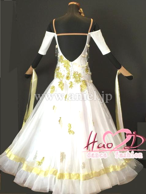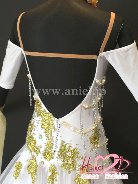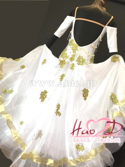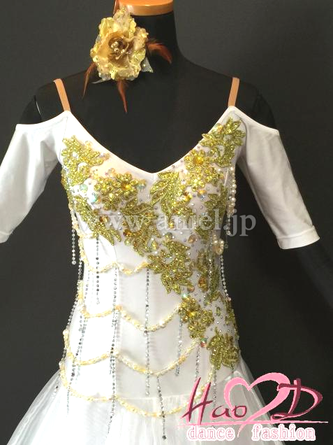 大人気な白色にゴールドのモチーフとビーズで上品に仕上げたモダンドレス;