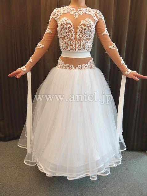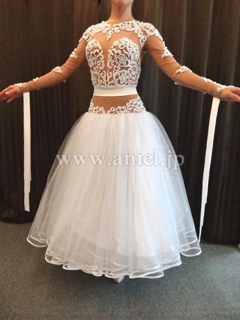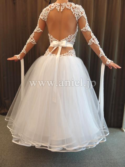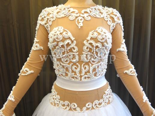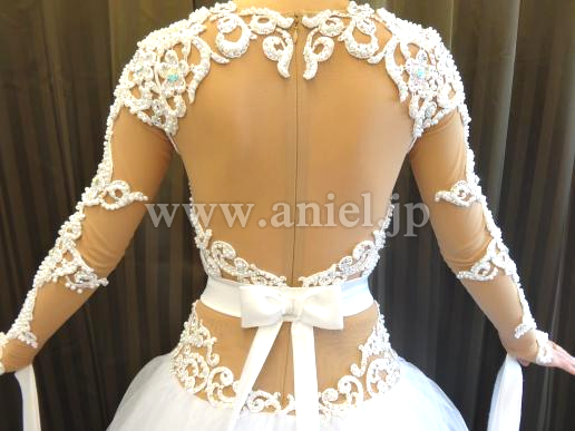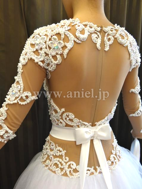 チュールスカートはボリュームたっぷり、リボンフロートや背中のリボンがとてもラブリーです。モチーフレースはストーンとパールで豪華に装飾されています。
