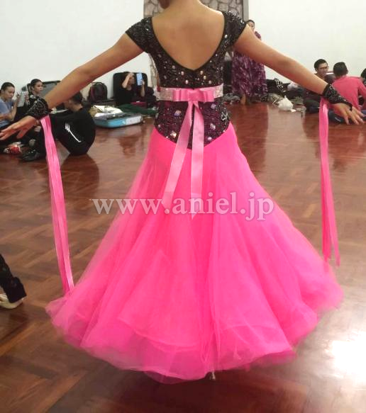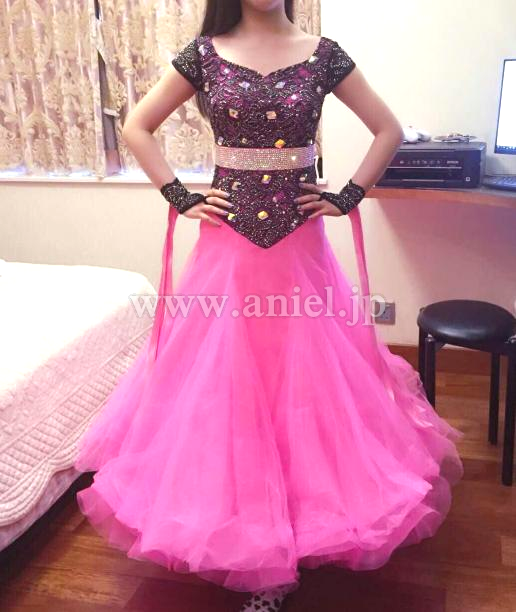 黒のレースが重ねられたボディにピンクのスカートがキュートなドレスです。