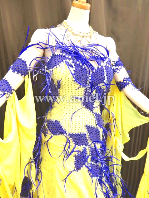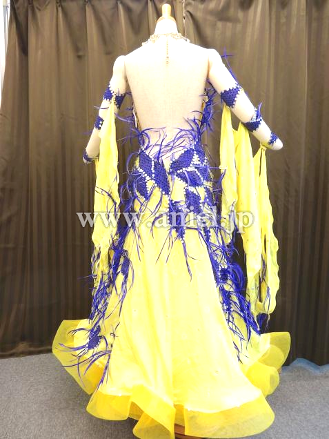 発色のいい黄色のパールシフォン生地のドレスです。紫のハンドメイドモチーフBIOT FEATHERがふんだんに使われています。石はすべてホットフィックスのスワロフスキーです。アクセサリーはネックレスとピアスです。