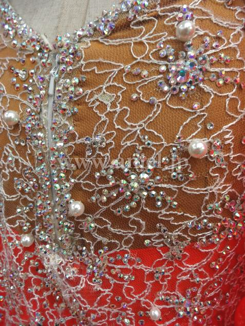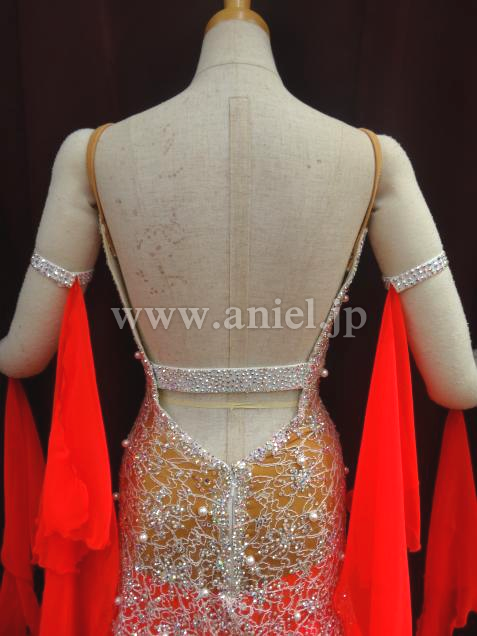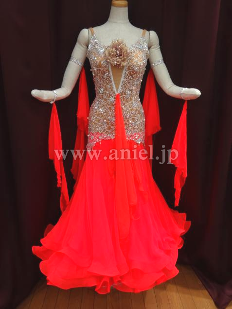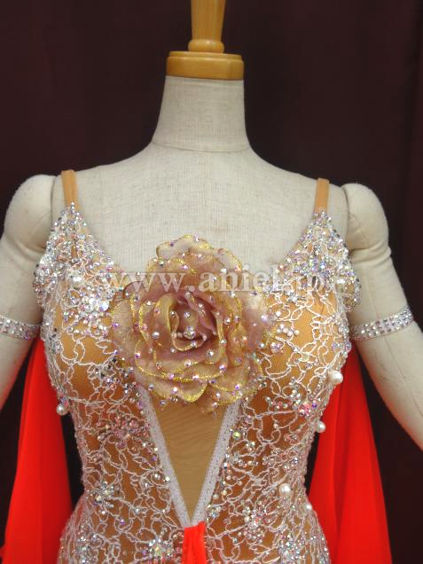 胸元にワンポイントとしてゴールドの立体フラワーモチーフが置かれています。