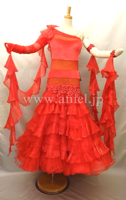 オフショルダーの肩の大きなリボンは可愛らしく、片腕袖のホールドはとてもエレガントです。スカートはチュール、サテン、オーガンジーを贅沢なほどにたっぷりと使い、とても綺麗なラインを出してくれます。