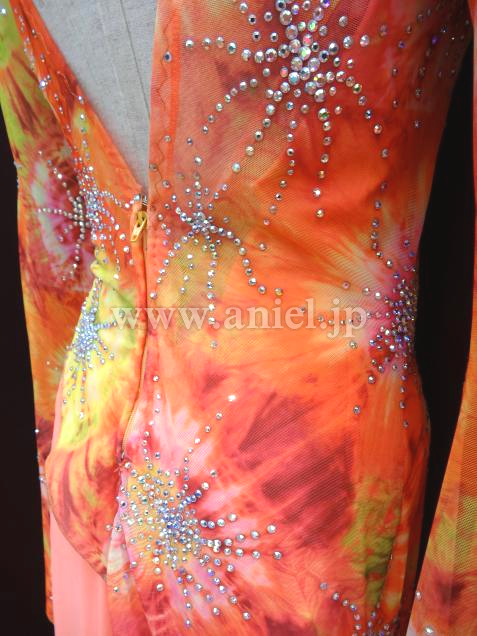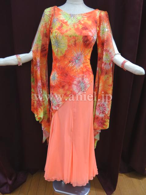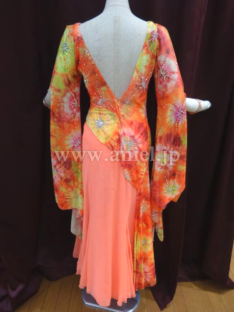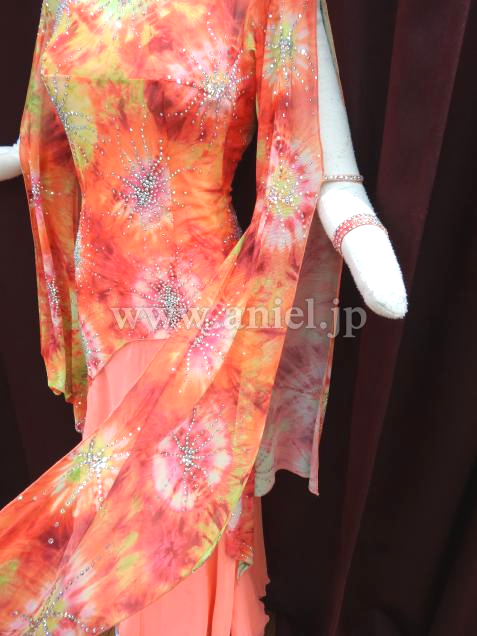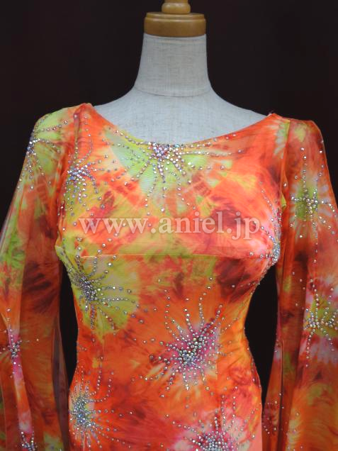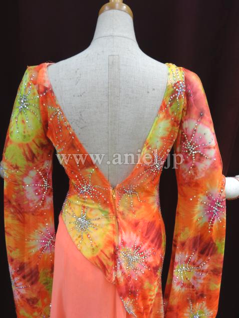 オレンジをベースした美しい柄の布をベースに使用しているドレス。