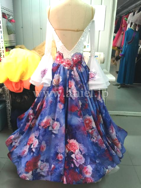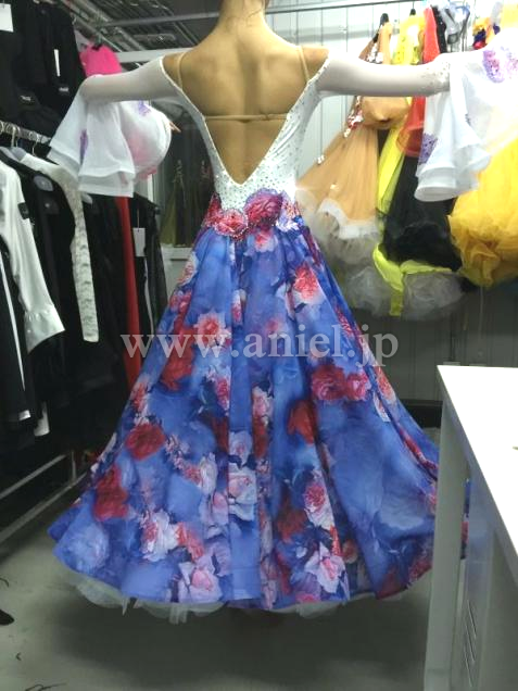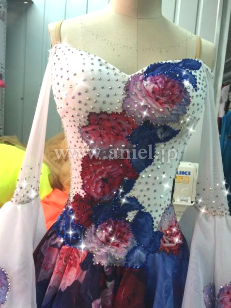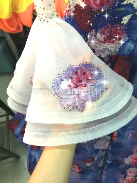 大きなフリル袖がエレガント。ボディにはスワロフスキーストーンとチェコ製ストーンが散りばめられています。