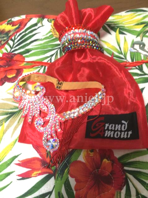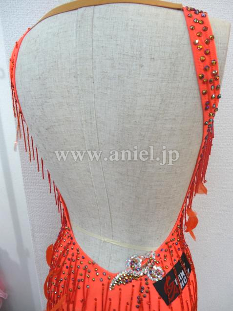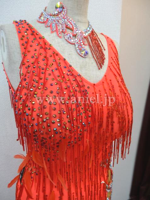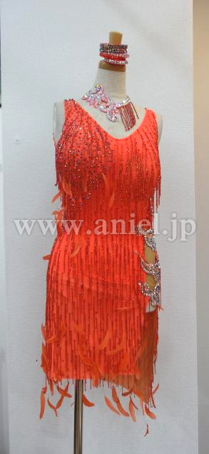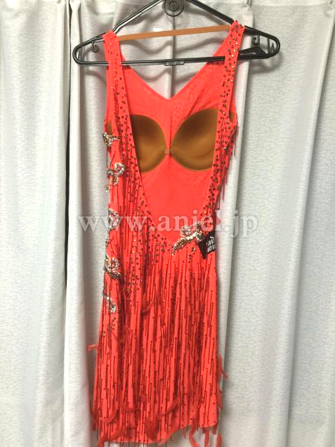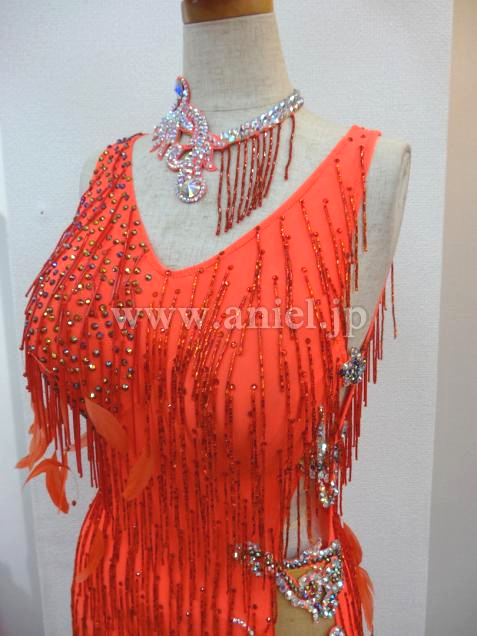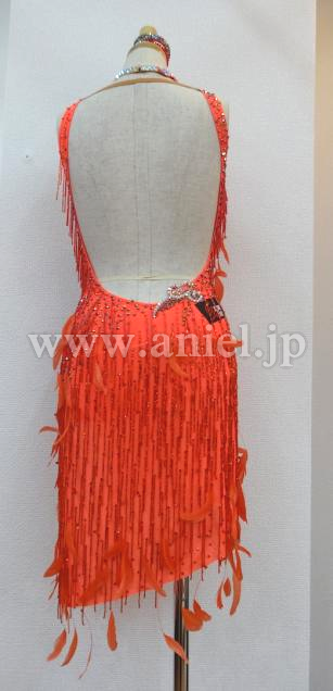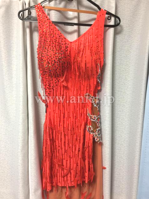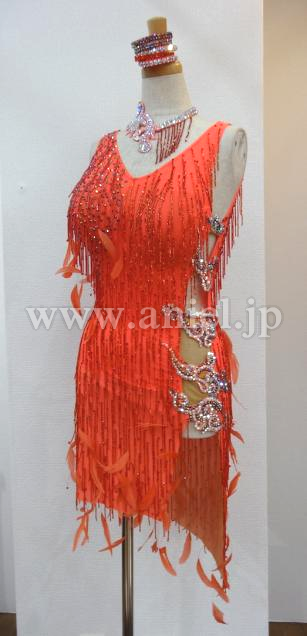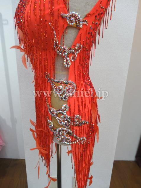 クリスアン製のメッシュ素材で作られています。ビーズフリンジと羽が踊るととても美しく動きます。片側だけ肌が見えるようになっており、セクシーです。シンプルですが、身体のラインが美しく見えるよう作られています。軽くてとても踊りやすいドレスです。