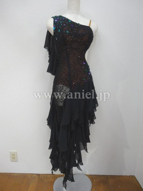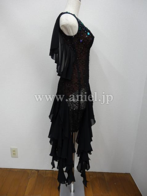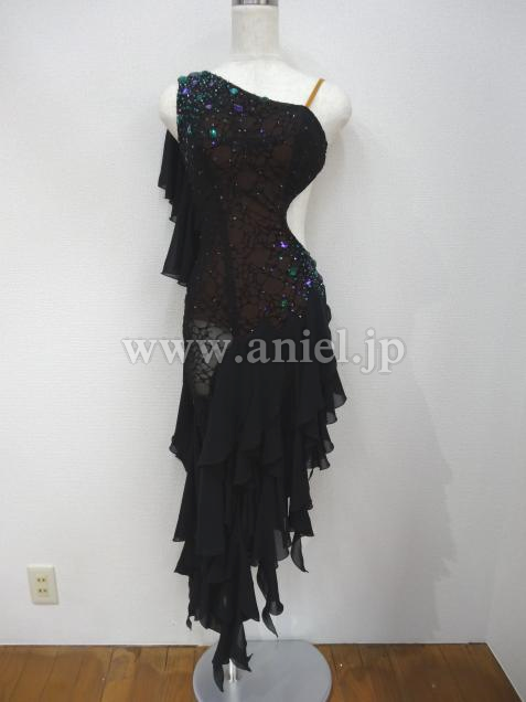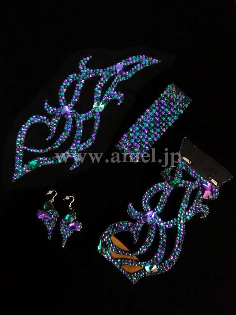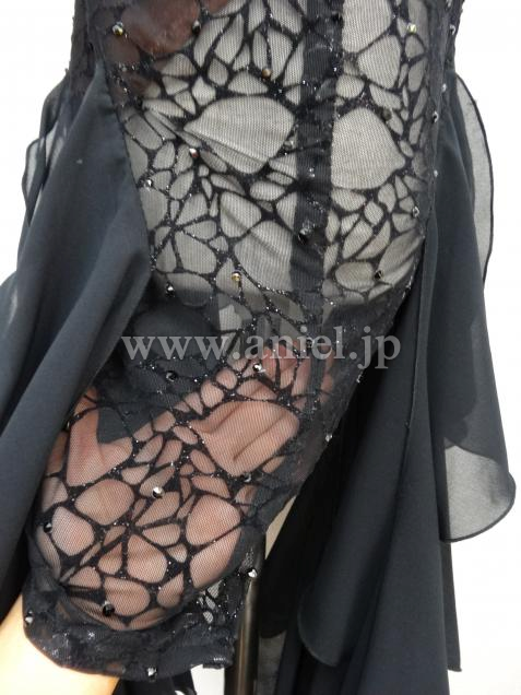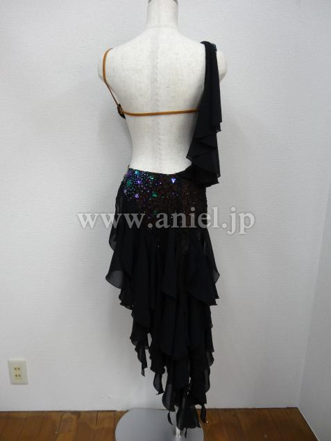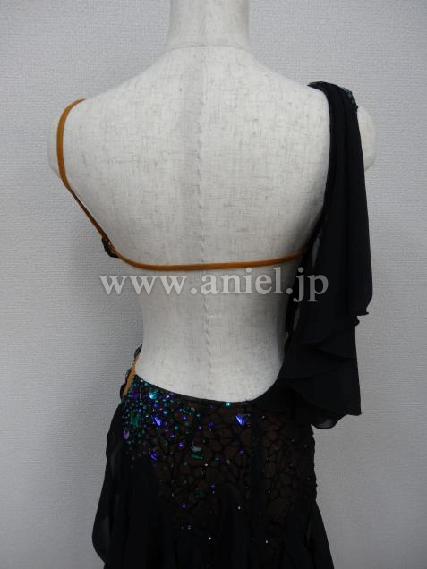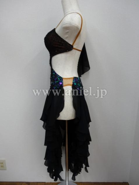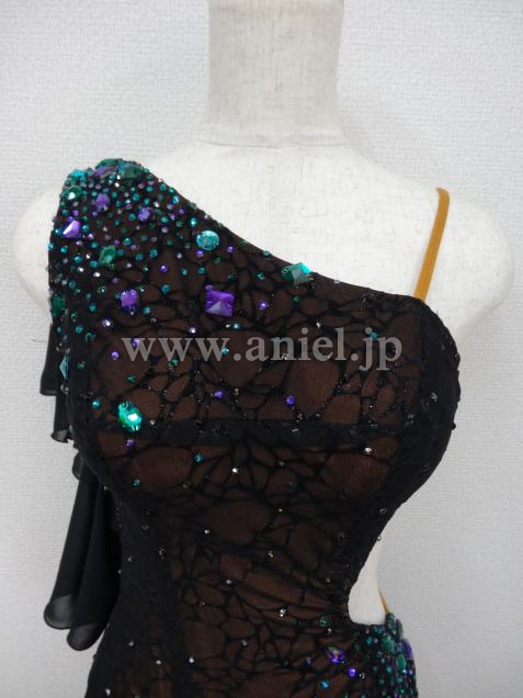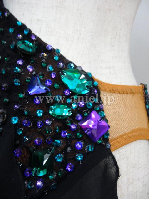 ボディ部分は黒のヒョウ柄レースに紫と緑のストーン、スカートはランダムにカットされた黒のジョーゼットで動きが軽やかです。
