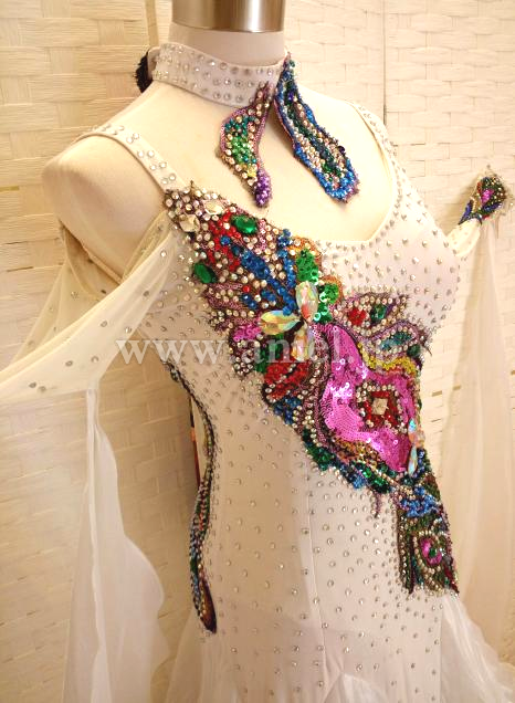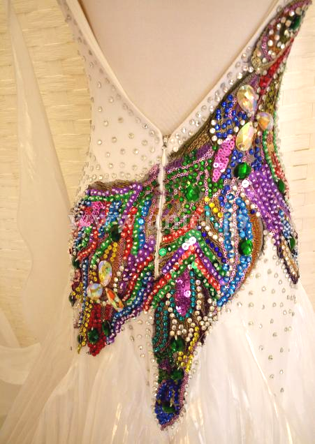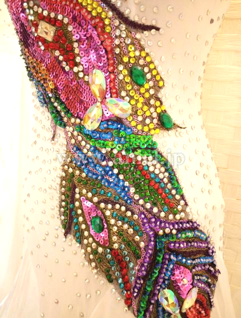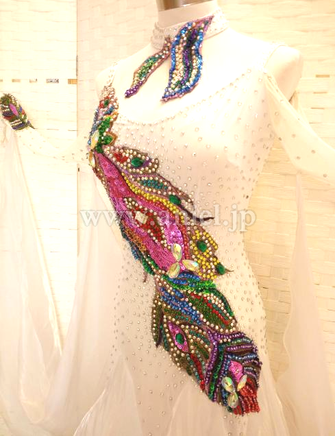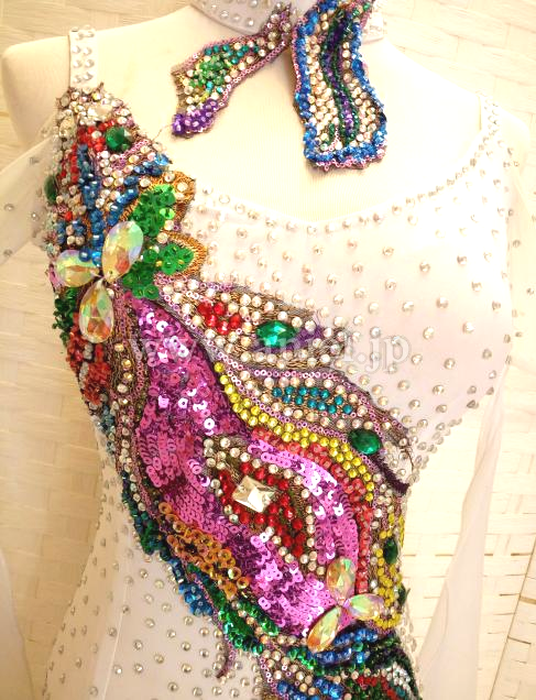 カラフルな光沢のモチーフがとても印象的なドレスです。