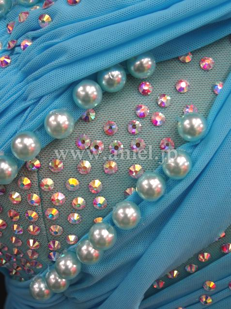ボディはモチーフレースの上にストーンがたっぷり飾られ、パールの装飾がアクセントになっています。