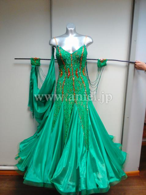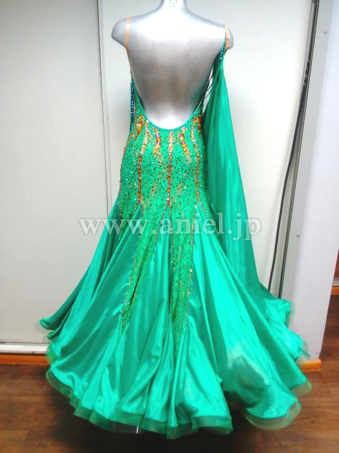インナースカートのピンクとオレンジが、緑との対比で、とても美しいドレスです。