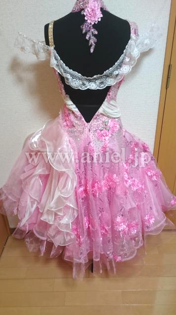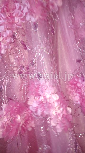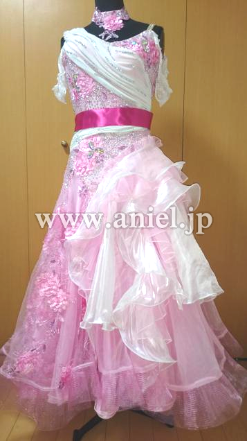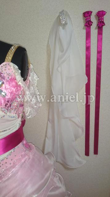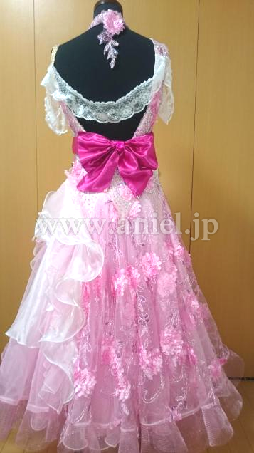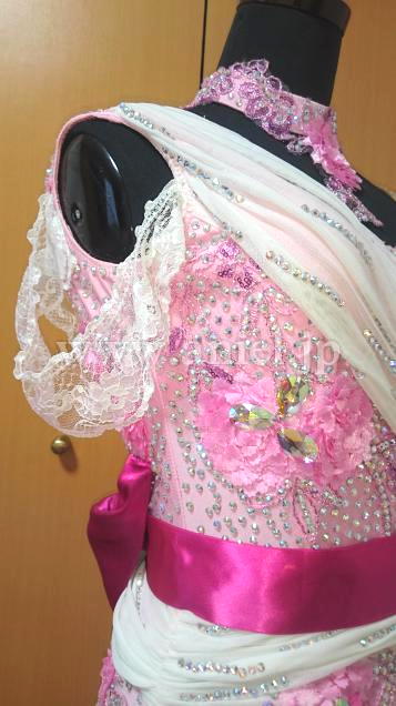 オフショルダーのレースが背中までつながっているデザインです。背中の大きなリボンとベルト部分は簡単に取り外して着ることもできます。スカートのピンク色の部分には立体的なお花のモチーフとキラキラした素材で柄がいっぱいに描かれています。白色の部分は素材やドレープのデザインがそれぞれ異なるオーガンジーを重ね合わせてあり、ボリュームがあります。フロートはリボンタイプです。白いフロートはおまけで付けます。チョーカー付き。