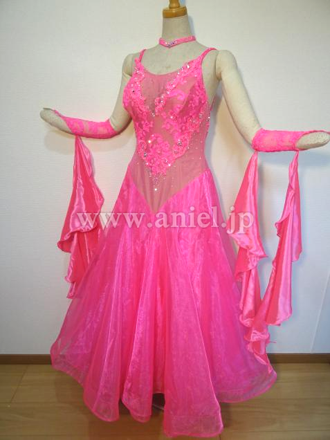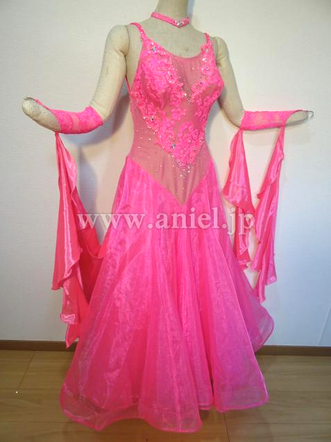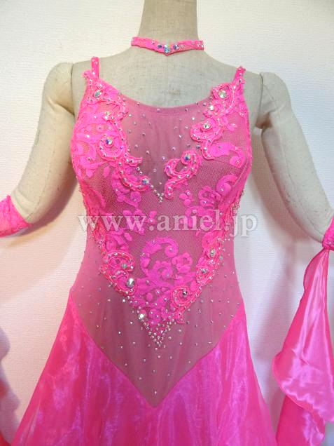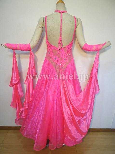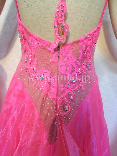 鮮やかなピンクドレスで、暗い会場でも目立ちます。上半身はピンクとVラインにベージュで切り替え、その上にチョイスロンドン社製のストレッチレースとモチーフレースを貼ってあり、スカートはチョイス社のオーガンジー2枚と3枚目はサテンで、全てにホースヘアーガ貼ってあり、軽く良く舞います。石は全てスワロフスキーです。手部分は短めのタイプで、クルンとしたフロートが付いています。18万のタグ付き試着のみの新品です。