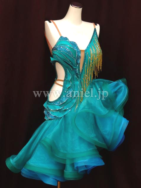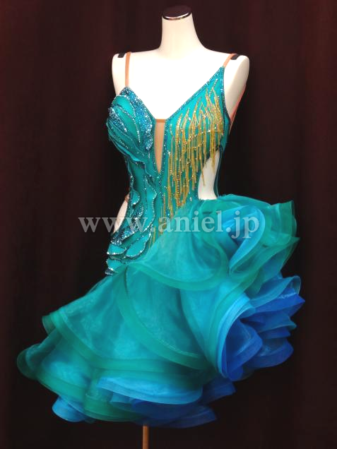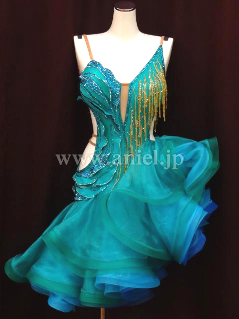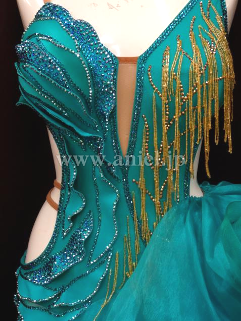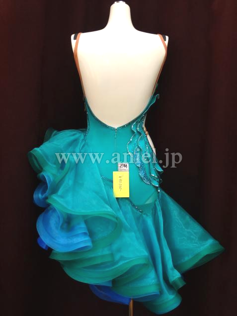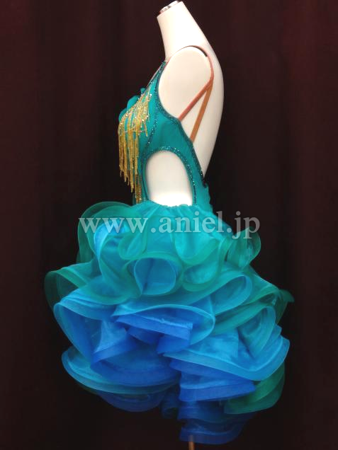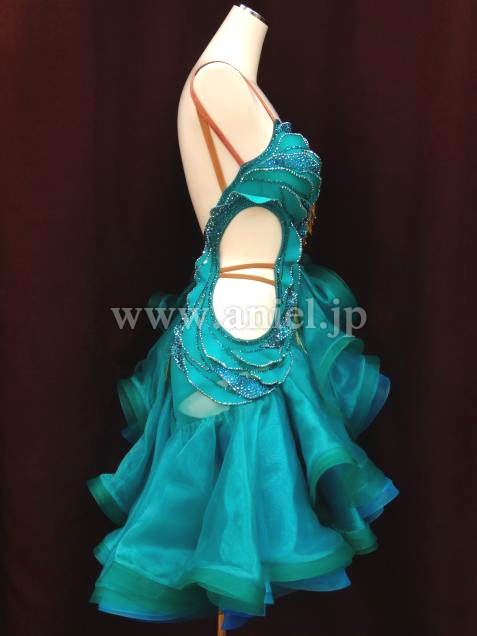 ジェードカラーに青のインナースカートのカラーのコントラストが上品で美しいドレスです。