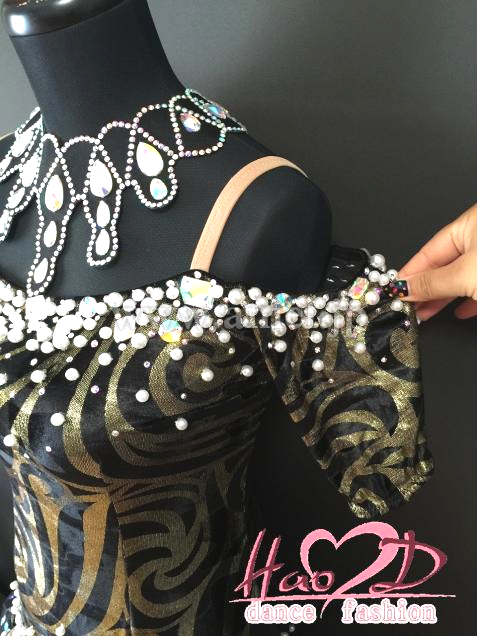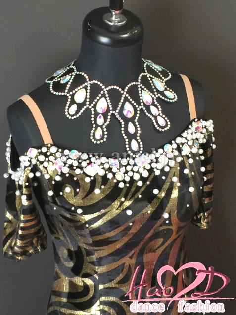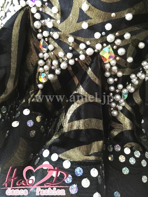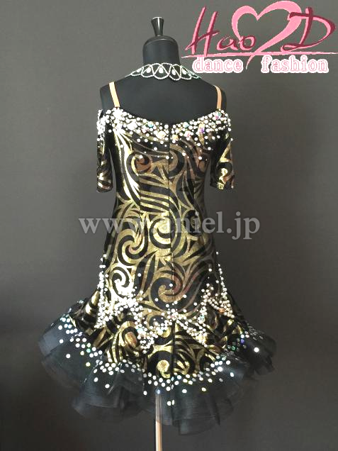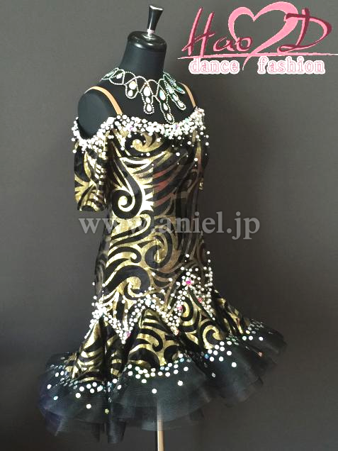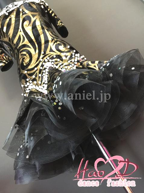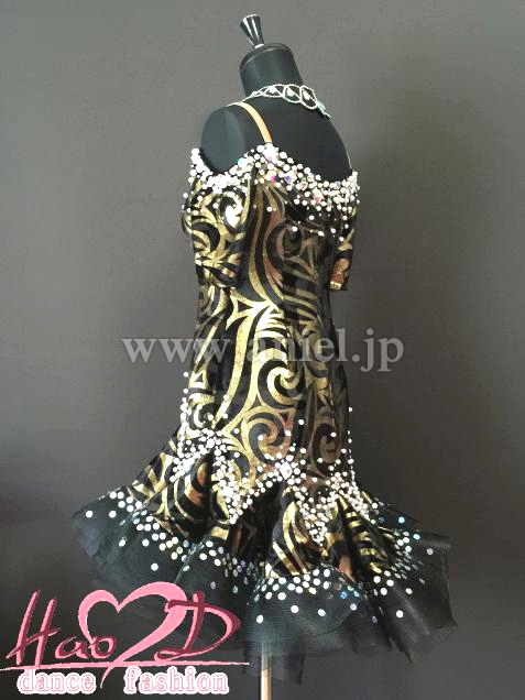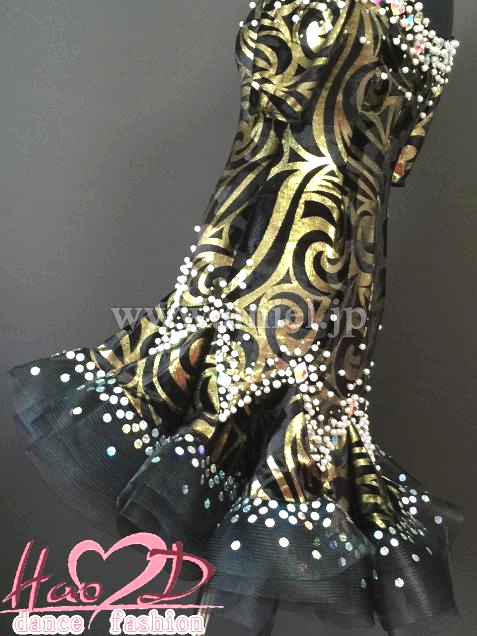 不規則なカール模様、跳ねるようなウエーブ状スカート、着痩せ効果抜群なラテンドレス;