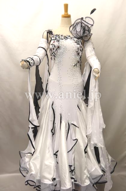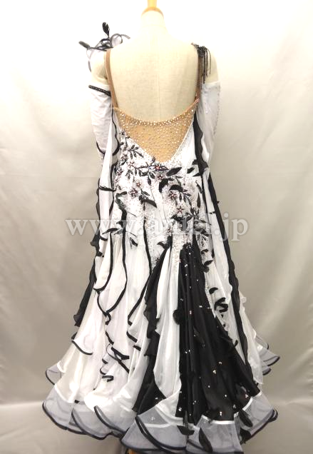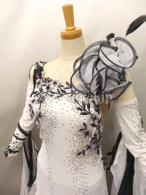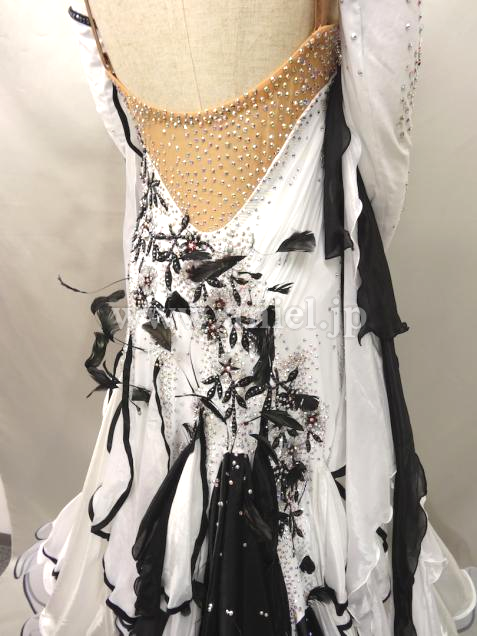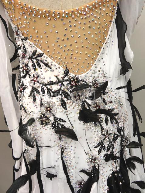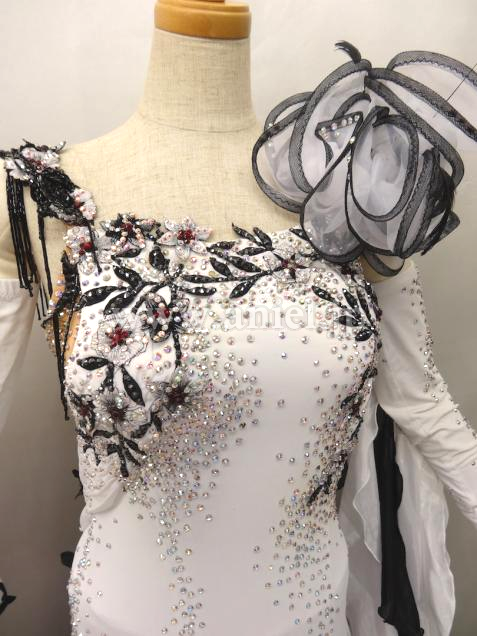 白のダンスクレープに黒のレースモチーフがあしらわれていて、クリスタルABとジェットヘマタイトの石を贅沢に使って美しく装飾されています。