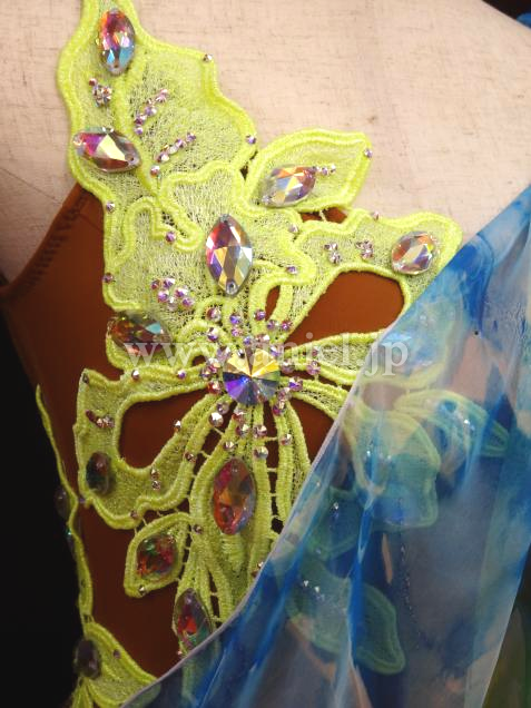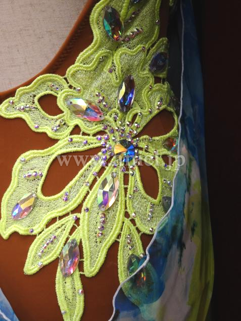 ボディには大きなモチーフレースが飾られ、大きいストーンとスワロフスキーストーンで装飾されています。